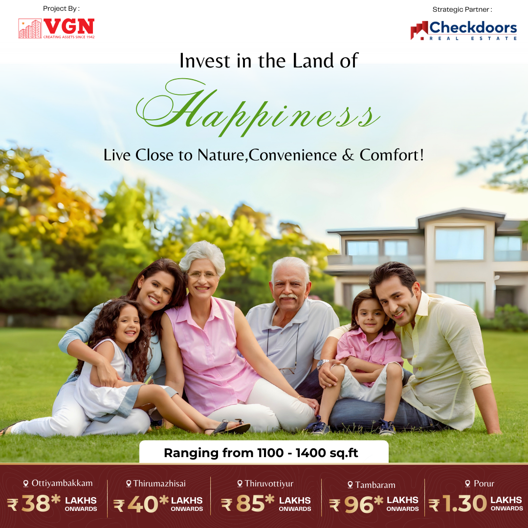 Founded in 1942, VGN is one of Chennai’s most trusted real estate pioneers. ISO 14001:2004 certified, we deliver thoughtfully designed projects that enhance quality of life and earn lasting customer trust.